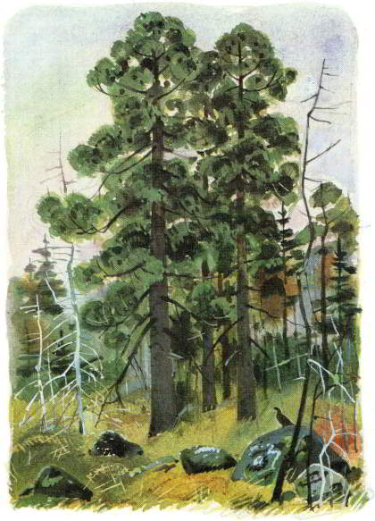 Живёт кедр долго. Встречаются деревья, которым лет четыреста, а то и все пятьсот. Нас и на свете не было, а эти кедры были почти такими же, как сейчас. Много повидали они на своём веку. И зимы, и вёсны менялись без счёта, а кедры стояли и покачивали на ветру своими пушистыми ветвями.