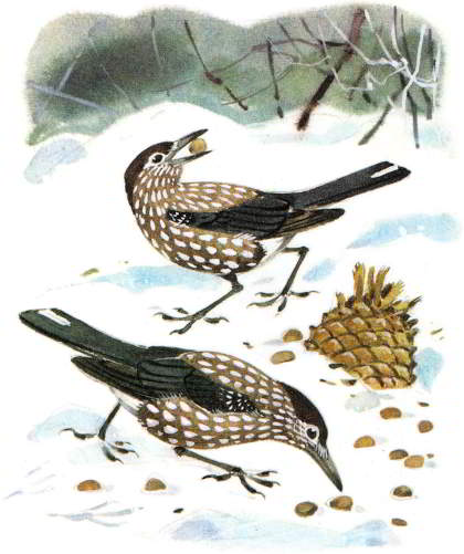 Величиной она с голубя. Грудка пятнистая, а клюв подлиннее голубиного и очень крепкий. Шелушит кедровка своим крепким клювом шишки, а орехи под язык кладёт. Там у неё специальный мешочек есть, прямо во рту. Наберёт кедровка десяток-другой орехов, не щёлкает их, а летит и прячет в укромное место. В ямку какую-нибудь положит, мхом, листиками, а то и землёй забросает. На зиму, на чёрный день.