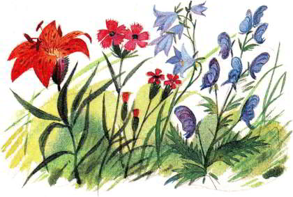А сколько в тайге разных цветов! Особенно много их на больших полянах и на лугах. Здесь и оранжево-красные с чёрными точками лилии, и огненные жарки, и лиловые ирисы… И гвоздики, и колокольчики, и ромашки, и маки… Всё и не перечислишь!