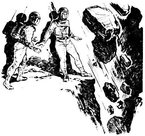 – Берегись! – закричал Соколов, с силой потянул его к себе. И в этот момент Володя с ужасом увидел, как откуда-то сверху медленно, словно нехотя, рушатся огромные глыбы. Глухая, ничем не нарушаемая тишина делала происходящее особенно страшным. Всего лишь в нескольких шагах от них падали и перекатывались массивные камни, но Володя лишь слышал частое дыхание Соколова. Великое безмолвие Луны нельзя было потревожить никакой катастрофой…