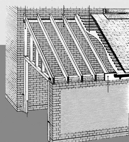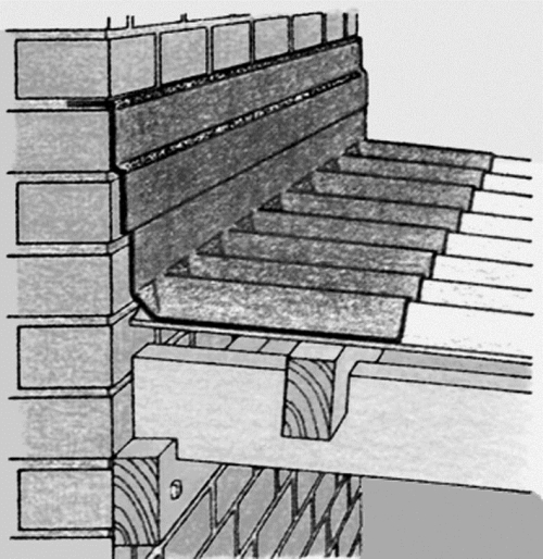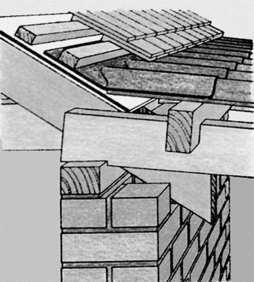На рис. 4.1.1.4 приведены два варианта крепления каркаса крыши примыкающего гаража к дому. При соединении каркаса с кирпичной стеной стропила опираются на прикрепленную к стене мощную балку. Щель между кровлей (гофрированный лист из пластика) и стеной укрывают пластиковым фартуком, верхний край которого загибают и вставляют в паз между кирпичами.