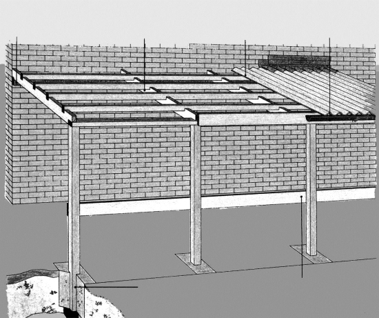 Конструкция примыкающего каркасного гаража с односкатной крышей показана на рис. 4.1.1.3. Крепление каркаса к стене дома производят посредством мощной балки, на которую кладут стропила. В пазах стропил закрепляют прогоны. К прогонам привинчивают гофрированные листы из пластика, выступающие по краям примерно на 5 см. К нижним концам стропил крепят карнизную доску, а к ней – опоры водосточного желоба. Стойки каркаса гаража крепят к выступающим из фундамента и забетонированным в него стальным анкерам. На высоте порядка 60 см изнутри к стойкам крепят продольную связь, придающую каркасу дополнительную жесткость.