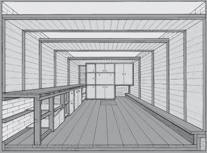 Слева от входа вдоль стены сделал верстак (рис. 4.1.1.6). Каркас и его столешница – из пятидесятки, дверцы – из ДСП,в ыдвижные ящики – из фанеры толщиной 10 мм, полки – из обрезков доски. На верстаке, ближе ко входу, установил малые слесарные тиски, подальше от входа – большие. В конце верстака укрепил квазитранец, к которому для хранения креплю подвесной лодочный мотор «Ветерок 8М». Вдоль задней стены сделал встроенный шкаф от пола до антресоли. Каркас его – из брусков, остальное – из ДСП.