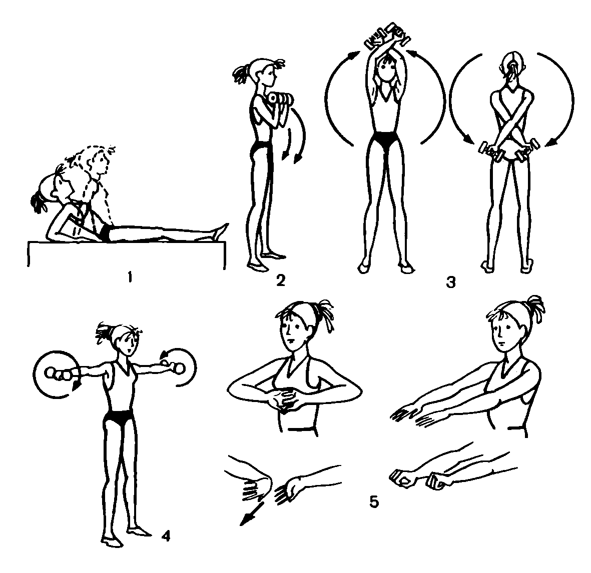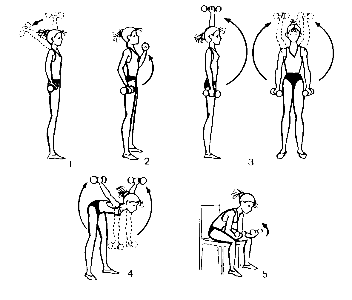 1. Стоя, возьмите в одну руку гантель и поднимите ее вверх. Не сгибая локоть, отведите руку за голову, затем примите и. п. То же проделайте другой рукой.