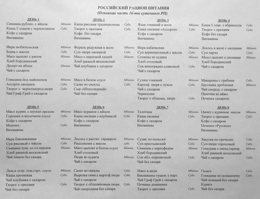 В народе бытует мнение, что космонавты до сих пор питаются из тюбиков пресной, термически обработанной пюреобразной пищей. Это не так. Наши космические миллионеры-аристократы давно не едят из тюбиков. У них там обширное, можно сказать, ресторанное меню. Разнообразие продуктов настолько большое, что его хватает на 16 дней. Другими словами, 16 дней кряду продукты в меню не повторяются. В общей сложности всего 160–180 наименований.