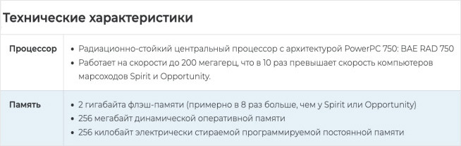 Процессор марсохода одноядерный и работает на частотах 110–200 мегагерц. Отличия RAD750 от давно устаревшего PowerPC750 в том, что он работает на более низких частотах и имеет меньше оперативной памяти: 700 мегагерц и 512 мегабайт оперативной памяти у PowerPC750 против 200 мегагерц и 256 мегабайт оперативной памяти у RAD750. А ещё он якобы умеет работать в условиях повышенной радиации и при больших перепадах температуры.