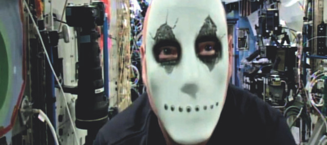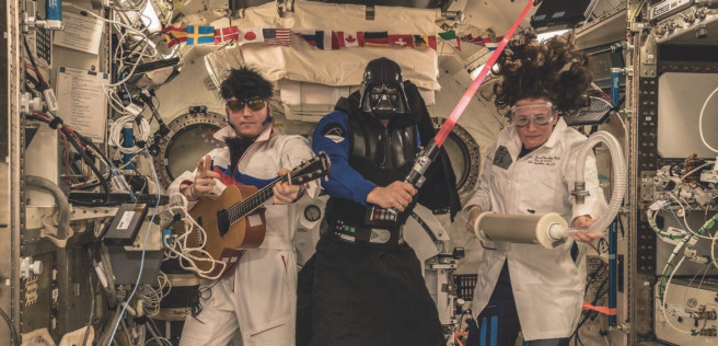 Российские космонавты не отстают от зарубежных коллег. Космонавт Сергей Прокопьев – «Элвис Пресли», рядом с «Дартом Вейдером» и женщиной-астронавтом в образе какого-то «сумасшедшего доктора».