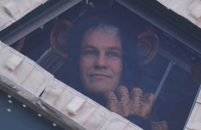 Космонавт Сергей Рязанский в костюме обезьяны на МКС.