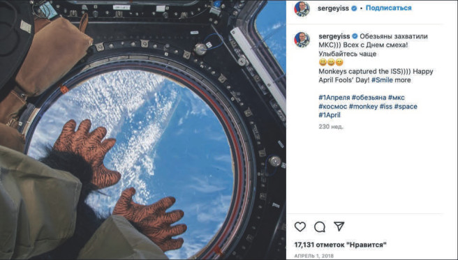 В этом посте опубликована фотография с орбитальной станции и подпись: «Обезьяны захватили МКС)))».