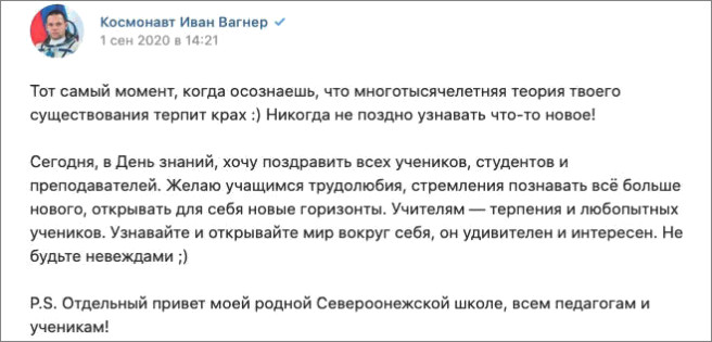 Произошла она в День знаний 1 сентября 2020 года. В этот день космонавт Роскосмоса Иван Вагнер опубликовал на своей странице «ВКонтакте» весьма странный поздравительный пост.