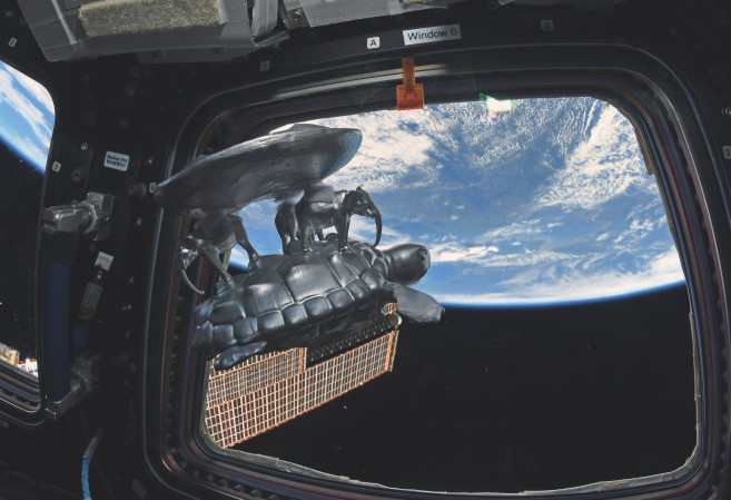 На представленном снимке запечатлена инсталляция в виде плоской Земли, которая покоится на трёх слонах, что стоят на большой черепахе. И всё это на фоне иллюминатора МКС, из которого открывается вид на закругляющуюся планету.