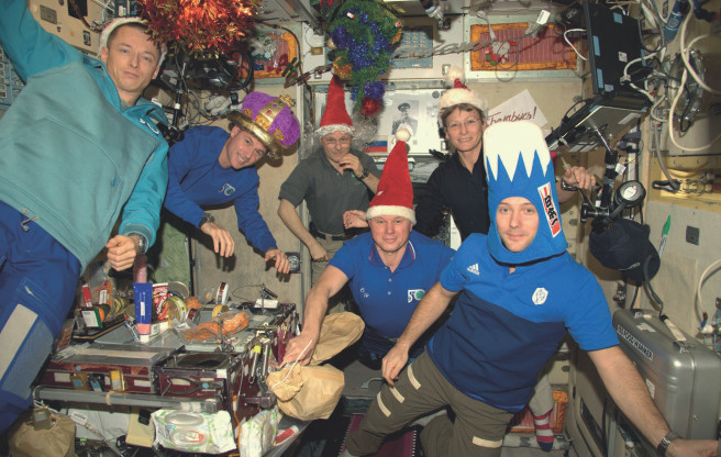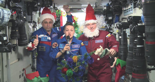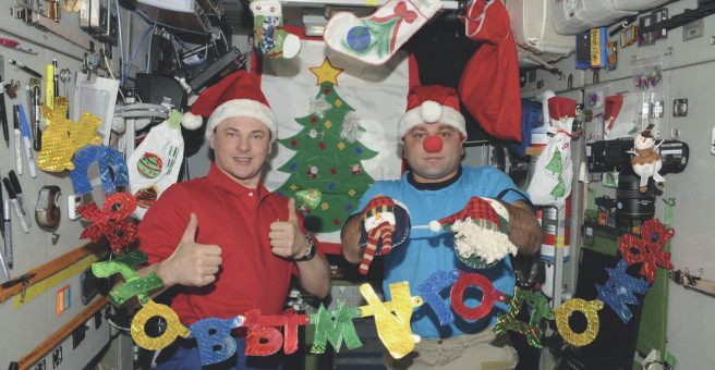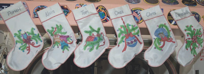На Рождество и новогодние праздники космонавты и астронавты украшают МКС мишурой, разноцветными флажками, елками с игрушками и шарами. А также по всей станции разрешивают именные носки для подарков.