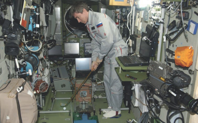 Космонавт Сергей Крикалёв играет в гольф на МКС.