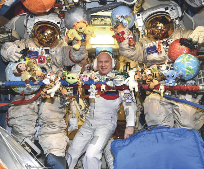 Обратите внимание на этот снимок. На нём космонавт Олег Артемьев, находясь на МКС, затерялся между обезьянок, тигрят, львят, зайчиков, змеек, черепашек, собачек, жирафиков, роботов из «Звёздных войн» и, главное, надувных планет.