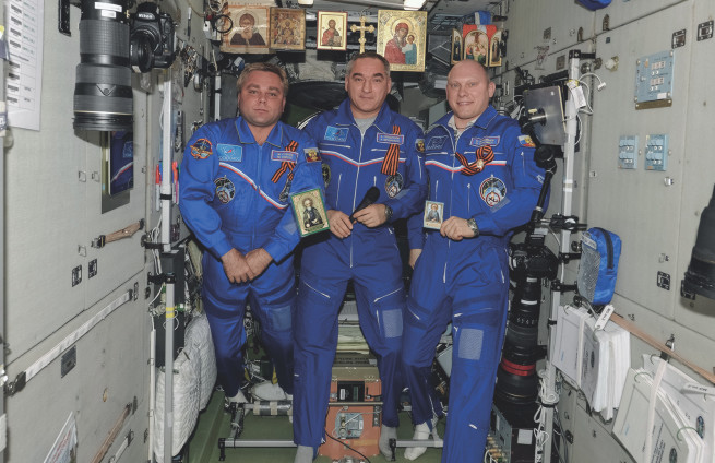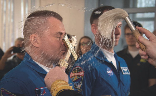 На одной из иллюстраций с МКС, представленной в этой книге, вы могли заметить православные иконы и большой крест. Скорее всего, вы знаете о традиции освящения ракет перед запуском. Может, даже видели, как священник опрыскивает космонавтов святой водой.