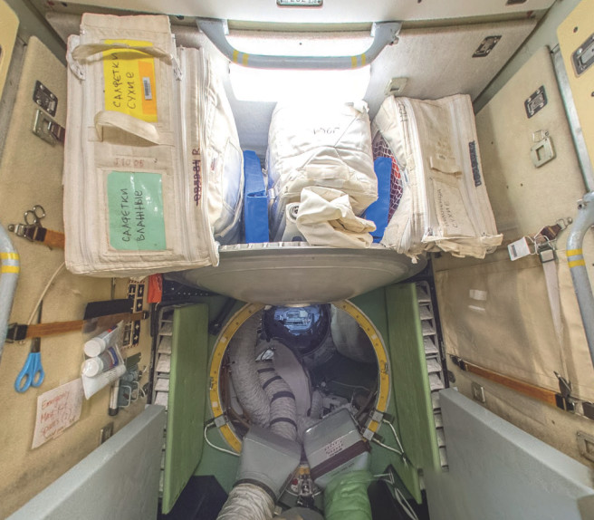 Данный люк точно так же используют в качестве полки для грузов и книжек. На изображении видна толстая и больше-форматная книга. По всей видимости, энциклопедия или справочник. Может, даже пособие о том, как эффективнее захламить орбитальную станцию.