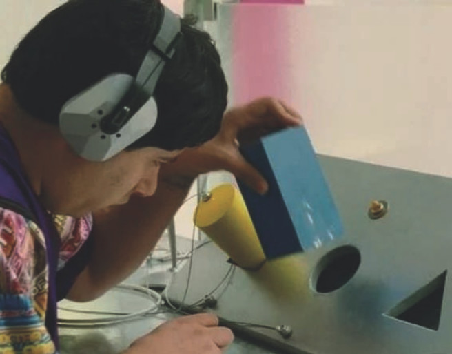 В этой сцене люди проходили тест, где нужно было вставить геометрические фигуры в соответствующие по форме отверстия, но никак не могли пройти.