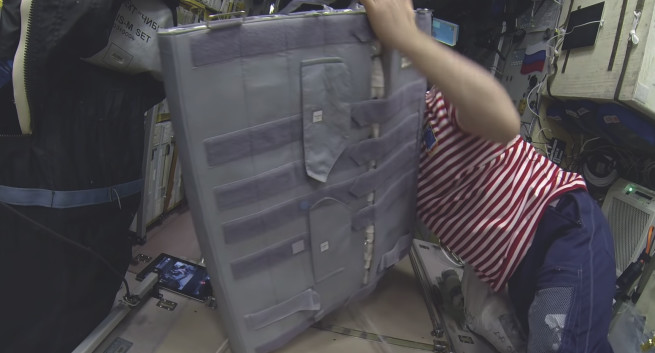 И вот такая вот защитная шторка. Вот такая защитная шторка… Надо будет ещё её сфотографировать для учёных. И что мы её складываем. Складываем… Видите, она даже в несколько слоёв получается. И вот… Вот такой вот мат. Получается „шторище“. Бронежилет против радиации. Мы ещё её установим в каюту. Щас посмотрим, как это делается».