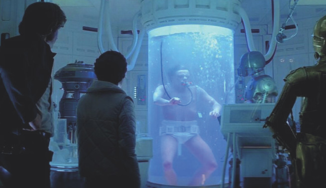 Ранее я говорил о том, что кабинка выглядит футуристично. И это неспроста. Всё дело в том, что задолго до того, как космонавты стали мыться в таких кабинах, похожую конструкцию показали в фантастическом фильме «Звёздные войны. Эпизод V: Империя наносит ответный удар».