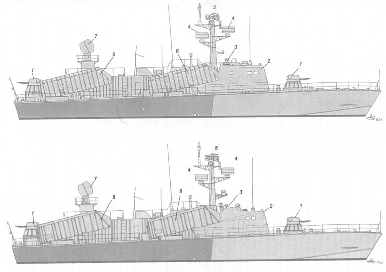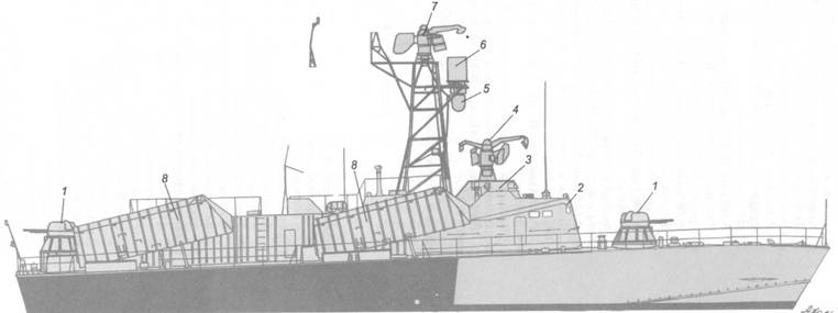 1 – 30-мм АУ АК-230; 2 – ходовая рубка; 3 – ходовой мостик; 4 – АП станции «Нихром» (системы опознавания); 5 – АП РЛС «Рангоут»; 6 – ТПК ПКРК П– 15У; 7 – АП РЛС СУАО «Рысь»; 8 – ТПК ПКРК П-15М («Термит»)