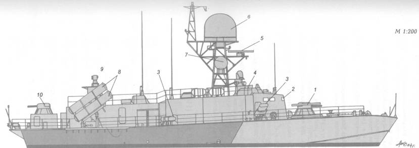 1 – 30-мм АУ АК-630М с ПУ ЗРК «Игла»; 2 – ходовая рубка; 3 – ПУ ПК-10 НУРС СППП; 4 – ходовой мостик; 5 – АП навигационной РЛС; 6 – основной (комплексный) АП РАК «Позитив-Э»; 7 – АП канала целеуказания (УСБД) РАК «Позитив -Э»; 8 – ТПК ПКРК «Уран-Э»; 9 – лазерный дальномер СУ АО; 10 – 30-мм АУ АК-630М.