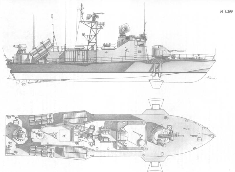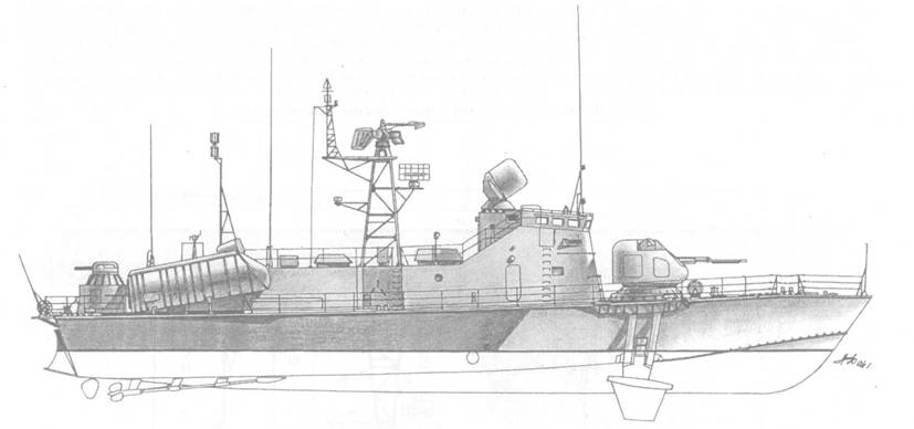 [Закрыть]) которые создавались под крылатые ракеты «Москит» и в качестве главных механизмов должны были иметь ди– зель-газотурбинную установку. Однако в связи с задержкой в освоении промышленностью ПКРК «Москит» и ДГТУ первая серия ракетных катеров этого семейства (пр. 1241.1) оснащалась ПКРК «Термит» и газотурбинной ЭУ. В экспортном варианте (пр. 1241РЭ) данные корабли имели ПКРК П-20 и также газотурбинную силовую установку.