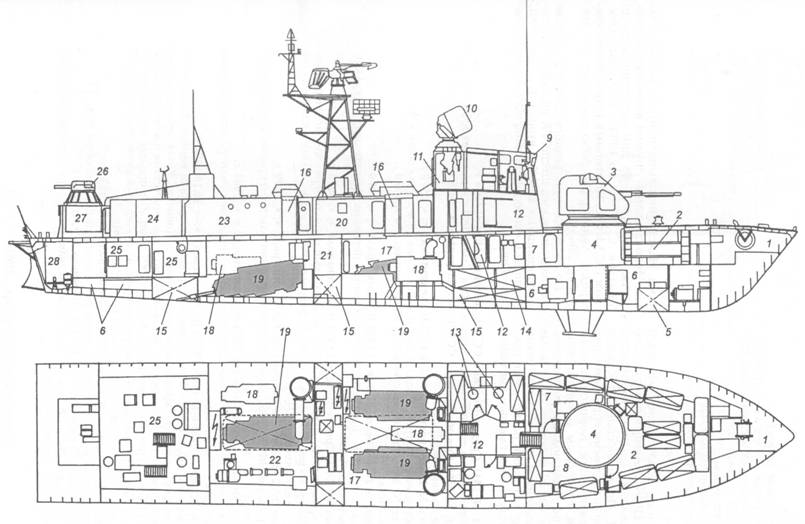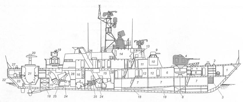 1 – ахтерпик; 2 – кладовые различного назначения; 3 – цепной ящик; 4 – 76-мм АУ АК-176; 5 – барбет 76-мм АУ; 6 – кубрики личного состава; 7 – боевые посты различного назначения; 8 – цистерна пресной воды; 9 – 30-мм АУ АК-630М; 10 – барбет 30-мм АУ; 11 – каюта командира корабля; 12 – коридор офицерских кают; 13 – ходовая рубка; 14 – ГКП; 15 – носовое МО; 16 – ПЭЖ; 17 – кормовое МО; 18 – топливные цистерны; 19 – АП СУ ЗРК «Оса-М»; 20 – ПУ ЗРК «Оса-М»; 21 – барбет ПУ ЗРК «Оса-М»; 22 – ахтерпик; 23 – румпельное отделение; 24 – ДГ; 25 – главные двигатели (ГТД); 26 – дымоходы ДГ; 27 – шахты газоходов ГТД; 28 – воздушно-вентилляционные шахты МО.