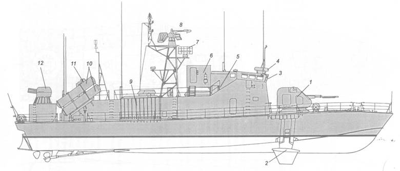 I – 76-мм АУ АК-176; 2 – подводное крыло (в рабочем положении); 3 – ходовая рубка; 4 – АП РЛС комплекса «Экран»; 5 – ходовой мостик; 6 – контейнеры с телеметрической аппаратурой СУАО «Ракурс»; 7 – АП станции «Пароль-3» (системы опознавания); 8 – АП РЛС «Гарпун»; 9 – контейнеры с телеметрической аппаратурой ПКРК «Уран»; 10 – ТПК ПКРК «Уран»;