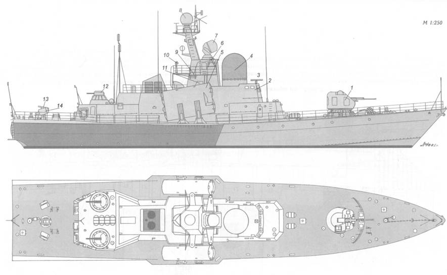 1 – 76-мм АУ АК-176; 2 – 30-мм АУ АК-630М; 3 – ходовая рубка; 4 – основной АП РАК «Галс»; 5 – визирная колонка СУАО «Вымпел»; 6 – АП РЛС СУАО «Вымпел»; 7 – компенсационное устройство пассивного канала РЛК «Галс»; 8 – АП РЛС пассивного канала РЛК «Галс»; 9 – АП РЛС «Гарпун»; 10 – АП станции «Пароль» (системы опознавания); 11 – ходовой мостик; 12 – ТПК ПКРК «Москит»; 13 – АП СУ ЗРК «Оса-М»; 14 – ПУ ЗРК «Оса-М».