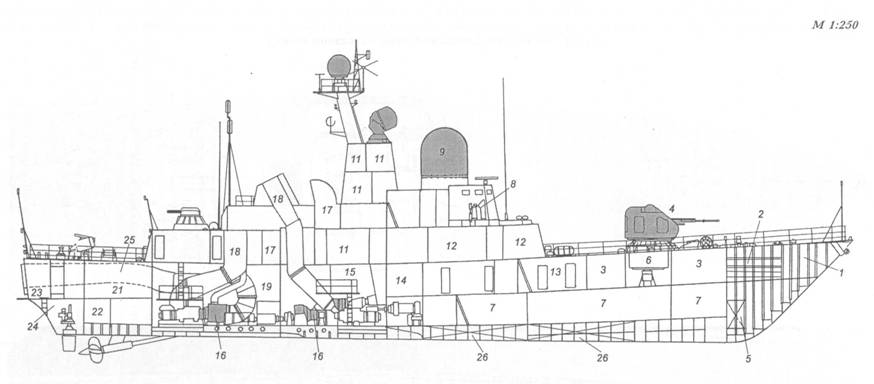 1 – форпик; 2 – кладовые различного назначения; 3 – кубрики личного состава; 4 – 76-мм АУ АК-176; 5 – цепной ящик; 6 – барбет 76-мм АУ;7 – боевые посты различного назначения; 8 – ходовая рубка; 9 – основной (комплексный) АП РАК «Монолит-Т»; 10 – АП РЛС СУАО «Вымпел»; 11 – выгородки ВЧ блоков; 12 – каюты офицеров; 13 – коридор; 14 – ПЭЖ; 15 – носовое МО; 16 – главные двигатели (ГТД); 17 – воздушно-вентилляционные шахты МО; 18 – дымоходы ДГ; 19 – кормовое МО; 20 – 30-мм АУ АК-630М; 21 – столовая личного состава; 22 – кладовые мокрой провизии; 23 – ахтерпик; 24 – румпельное отделение; 25 – шахты газоходов ГТД; 26 – топливные цистерны.