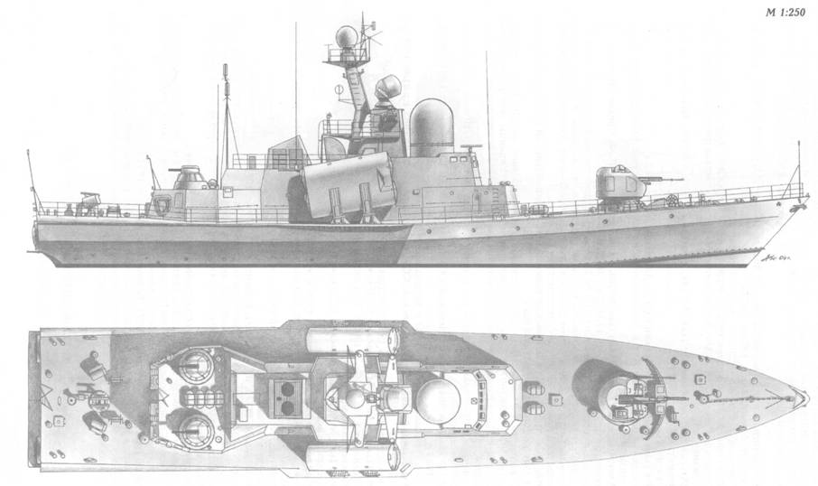 Схема внешнего вида ракетного катера Р-161 после модернизации по пр. 205ЭМ-.