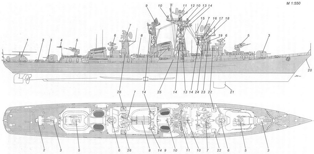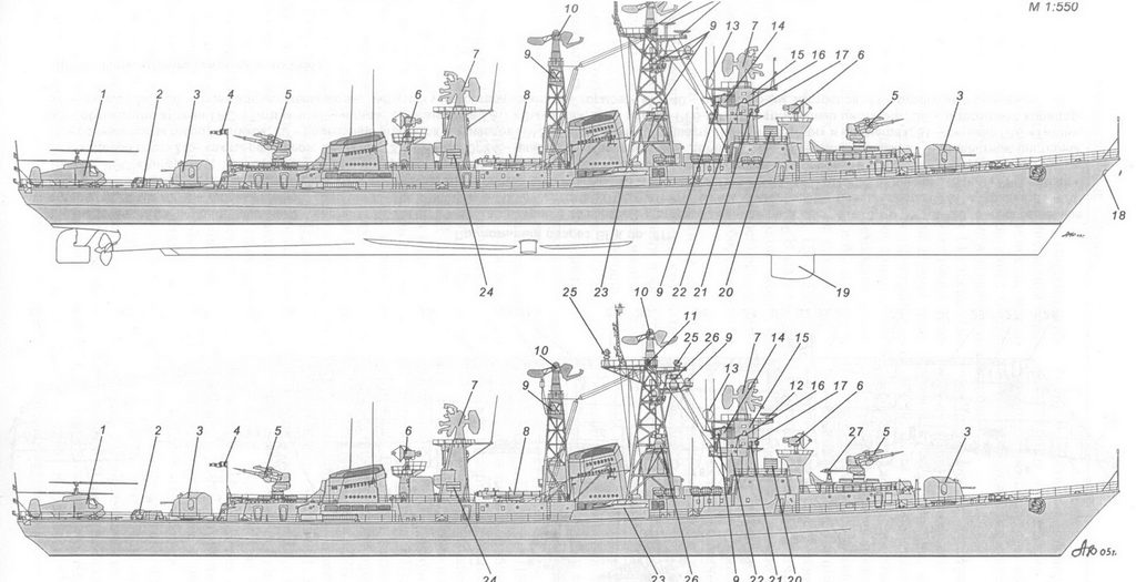 1 – вертолет Ка-25ПЛ*; 2 – рубка дежурного по кораблю и стартовый командный пост; 3 – 76-мм АК-726; 4 – съемный конус ветроуказателя; 5 – ПУ ЗРК «Волна-М»; 6 – АП РЛС СУАО «Турель»; 7 – АП РЛС СУ «Ятаган»; 8 – 533-мм ТА ПТА-53-61; 9 – АП станций «Краб-11» и «Краб-12»; 10 – АП РЛС «Ангара»; 11 – АП станции «Бизань-4Б»; 12-АП РЛС «Дон-2»; 13-АП радиопеленгатора АРП-50; 14 – сигнальный мостик; 15-ходовая и штурманская рубки; 16 – оптический перископический визир ходового поста; 17 – ходовой пост; 18 – датчик СОТС; 19 – обтекатель антенн ГАС «Титан» и «Вычегда»; 20 – РБУ-6000; 21 – оптический пенрископический визир ГКП; 22 – ходовой мостик; 23 – командирский катер; 24 – РБУ-1000; 25 – АП РЛС «Волга»; 26 – стабилизированный пост ТВ системы наблюдения за ближней надводной обстановкой МТ-45; 27 – 45-мм салютная пушка.