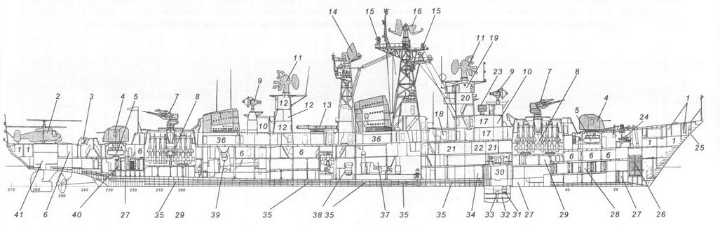 1 – кладовые различного назначения; 2 – вертолет Ка-25ПЛ; 3 – рубка дежурного по кораблю и стартовый командный пост; 4 – 76-мм АУ АК-726; 5 – подбашенное отделение 76-мм АУ; 6 – кубрики личного состава; 7 – ПУ ЗРК «Волна-М»; 8 – погреб ЗУР; 9 – АП РЛС СУАО «Турель»; 10 – боевые посты СУАО «Турель»; 11 – АП РЛС СУ «Ятаган»; 12 – боевые посты и выгородки высокочастотных блоков СУ «Ятаган»; 13 – 533-мм ТА ПТА-53-61; 14 – АП РЛС «Кливер»; 15 – АП РЛС «Волга»; 16 – АП РЛС «Ангара-А»; 17 – боевые посты и выгородки высокочастотных блоков РТВ; 18 – кают-компания офицеров; 19 – ходовая и штурманская рубки; 20 – ходовой пост; 21 – каюты офицеров; 22 – ГКП;23 – РБУ-6000; 24 – шпилевое отделение; 25 – датчик СОТС; 26 – цепной ящик; 27 – балластные цистерны; 28 – боевые посты гидроакустиков; 29 – помещение агрегатов и приводов ПУ ЗРК «Волна-М»; 30 – шахта ПОУ ГАС «Титан» и «Вычегда»; 31 – антенна ГАС «Титан»; 32 – обтекатель антенн ГАС «Титан» и «Вычегда»; 33 – антенна ГАС «Вычегда»; 34 – погреб РГБ-60; 35 – топливные цистерны; 36 – штормовой коридор; 37 – носовое МО; 38 – отсек вспомогательных механизмов и успокоителя качки; 39 – кормовое МО; 40 – погреб 76-мм выстрелов; 41 – румпельное отделение.