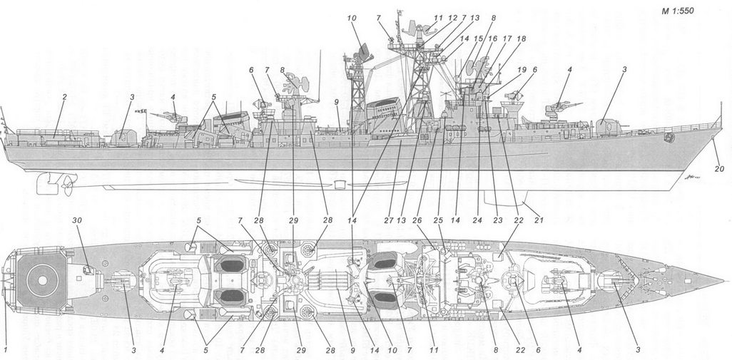 [Закрыть]); 8 – АП РЛС СУ «Ятаган»; 9 – 533-мм ТА ПТА-53-1123/2; 10-АП РЛС «Кливер»; 11 – АП РЛС «Ангара-А»; 12-АП станции «Бизань-4Б»; 13 – стабилизированный пост ТВ системы наблюдения за ближней надводной обстановкой МТ-45; 14 – АП станции «Залив»; 15 – АП радиопеленгатора АРП-50Р; 16 – сигнальный мостик; 17 – ходовая и штурманская рубки; 18 – оптический перископический визир ходового поста; 19 – ходовой пост; 20 – датчик СОТС; 21 – обтекатель подкильной антенны ГАК «Платина»; 22 – РБУ-6000; 23 – оптический перископический визир ГКП; 24 – ходовой мостик; 25 – АП комплекса средств РЭБ «Старт»; 26 – ПУ НУРС СППП ПК-16; 27 – командирский катер; 28 – 30-мм АУ АК-630М; 29 – АП РЛС СУАО «Вымпел-А»; 30 – стартовый командный пост.