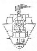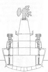 ГТА располагались в двух машинных отделениях, носовой работал на правый гребной вал, а кормовой – на левый. Кроме суммирования мощности двух двигателей, редуктор обеспечивал реверс гребного винта, а также подключение и отключение ГТД с помощью кулачково-фрикционных и гидравлических муфт. Кроме газотурбозуб– чатого агрегата в каждом машинном отделении размещались по два газотурбогенератора. Из-за большого шума работающих газовых турбин управлять главной энергетической установкой можно было только из специального поста. Шум также оказывал негативное влияние на обитаемость. Кроме того, жилые помещения имели плохую систему вентиляции и в них практически отсутствовали иллюминаторы. На кораблях пр. 61 имелись две пары газоотводных труб, размещенных над машинными отделениями. Их форма и размеры были выбраны с учетом возможности замены газовых турбин через люки труб, а также снижения температуры выходящих газов за счет смешения их с воздухом в кожухе трубы.
