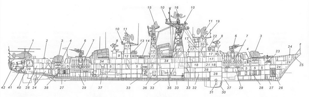 1 – вертолет Ка-25ПЛ; 2 – стартовый командный пост; 3 – 76-мм АУ АК-726; 4 – подбашенное отделение 76-мм АУ; 5 – кубрики личного состава; 6 – ПУ ЗРК «Волна-М»; 7 – погреб ЗУР; 8 – АП РЛС СУАО «Турель»; 9 – боевые посты СУАО «Турель»; 10 – АП РЛС «Волга»; 11 – АП РЛС СУ «Ятаган»; 12 – боевые посты и выгородки высокочастотных блоков СУ «Ятаган»; 13 – 30-мм АУ АК-630М; 14 – 533-мм ТА ПТА-53-61; 15 – АП РЛС «Кливер»; 16 – АП РЛС «Ангара-А»; 17 – боевые посты и выгородки высокочастотных блоков РТВ; 18 – каюты офицеров; 19 – ходовая и штурманская рубки; 20 – ходовой пост; 21 – ГКП; 22 – РБУ-6000; 23 – шпилевое отделение; 24 – кладовые различного назначения; 25 – датчик СОТС; 26 – цепной ящик; 27 – балластные цистерны; 28 – боевые посты гидроакустиков; 29 – помещение агрегатов и приводов ПУ ЗРК «Волна-М»; 30 – обтекатель подкильной антенны ГАК «Платина»; 31 – антенна подкильной антенны ГАК «Платина»; 32 – погреб РГБ-60; 33 – топливные цистерны; 34 – штормовой коридор; 35 – носовое МО; 36 – отсек вспомогательных механизмов и успокоителя качки; 37 – кормовое МО; 38 – погреб 76-мм выстрелов; 39 – румпельное отделение; 40 – лебедка ПОУ буксируемой антенны ГАК «Платина»; 41 – ПОУ буксируемой антенны ГАК «Платина»; 42 – рабочее тело буксируемой антенны ГАК «Платина».