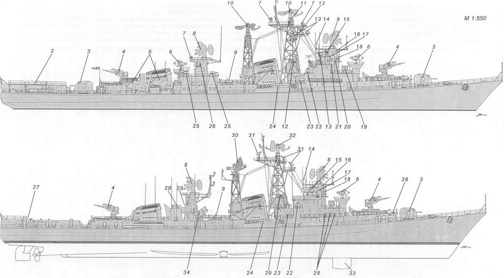 1 – вертолет Ка-25ПЛ; 2 – рубка дежурного по кораблю и стартовый командный пост; 3 – 76-мм АК-726; 4 – съемный конус ветроуказателя; 5 – ПУ ЗРК «Волна-М»; 6 – АП РЛС СУАО «Турель»; 7 – АП РЛС СУ «Ятаган»; 8 – 533-мм ТА ПТА-53-61; 9 – АП станции «Залив»; 10 – АП РЛС «Кливер»; 11 – АП РЛС «Ангара-А»; 12 – АП станции «Бизань-4Б»; 13-АП РЛС «Волга»; 14-АП радиопеленгатора АРП-50; 15 – сигнальный мостик; 16-АП РЛС «Дон-2»; 17-ходовая и штурманская рубки; 18 – оптический перископический визир ходового поста; 19 – ходовой пост; 20 – обтекатель антенн ГАС «Титан» и «Вычегда» (в поднятом состоянии); 20 – РБУ-6000; 22 – оптический пенрископический визир ГКП; 23 – ходовой мостик; 24 – командирский катер; 25 – РБУ-1000; 26 – ПУ ЗРК «Ураган»; 27 – АП СУ (радиопрожектор) ЗРК «Ураган»; 28 – АП РЛС «Фрегат-М»; 29 – АП радиопеленгатора АРП-50Р; 30 – 45-мм салютная пушка; 31 – ПУ НУРС СППП ПК-16.