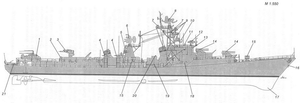 1 – ВПП; 2 – ПУ ПКР КСЩ; 3 – погреб ПКР ПСЩ; 4 – спасательный плотик; 5 – 570мм АУ ЗИФ-75; 6 – визирные колонки приборов управления стоельбой зенитного калибра (ПУС ЗК) «Фут-Б-2»; 7 – АП РЛС ПУС ЗК «Фут-Б-2»; 8 – 533-мм ТА; 9 – АП радиопеленгатора АРП-50; 10 – АП РПС ХараГl7– А П?ЛС Тзаря» обеспечения ПУТС «Звук-57»); 12 – АП навигационной РЛС «Нептун»; 13 – стабилизированный визирный пост ПУС ЗК «Фут-Б-2»-'l4 – ходовой мостик15 – ходовая рубка; 16 – РБУ-2500; 17 – обтекатель антенны ГАС «Титан-2»; 18 – командирский катер; 19 – 533-мм ТА ПТА-53-1134; 20 – визирная колонка СУАО «Рысь»; 21 – охранительное устройство БОКА-Ду.