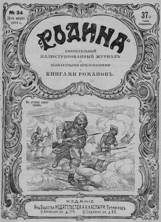 Рис. 12. В атаку среди газов. Обложка журнала «Родина», № 34, от 23-го августа 1915 г.