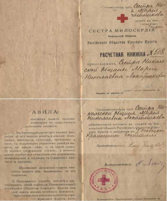Рис. 34. Расчетная книжка сестры милосердия Осовецкого крепостного военного госпиталя № 1 Марии Николаевны Лопатниковой (в девич. Федорова). 1915 г.