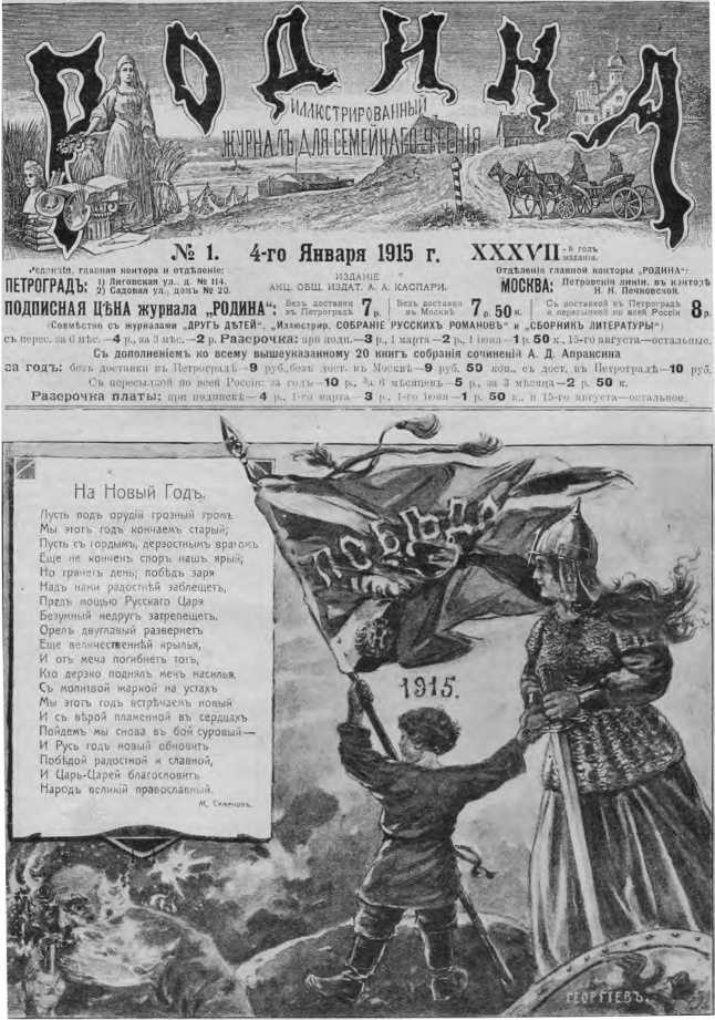 Рис. 41. Обложка первого – новогоднего выпуска журнала «Родина» за 1915 г., с изображением «отложенной мечты» – Знаменем Победы над Германией.