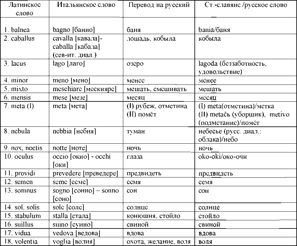 Как полагают историки и лингвисты, и латинский язык, и древнеславянский имели некогда в качестве первоосновы арийский (индоевропейский) язык, на котором говорили наши далекие предки. Поэтому латинский и славянский языки имеют много однокоренных или похожих слов с одинаковым значением. Как видно из представленных данных, в итальянском языке многие из этих латинских слов претерпели трансформацию, став намного ближе по звучанию к аналогичным славянским словам: «бальнео» – «банна» (баня), «окулус» – «окно» (око), «волентиа» – «волия» (воля) и т. д. А некоторые слова, например, “meta”, приобрели второе значение, которое есть у аналогичного славянского, но не было у прежнего латинского слова. Таким образом, и эти данные свидетельствуют о важной роли славян в формировании итальянского языка.