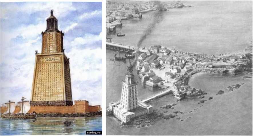 Александрийский маяк и остров Фарос в бухте Александрии с панорамой города (реконструкция). Источники: http: ctodav.ru, wk historyweb. ruПо своим размерам Александрийский маяк сопоставим с небоскребами Нью-Йорка: по существу он и представлял собой 40-этажный небоскреб, на вершине которого находился маяк. Человечество вновь научилось строить такие здания лишь к XX веку.