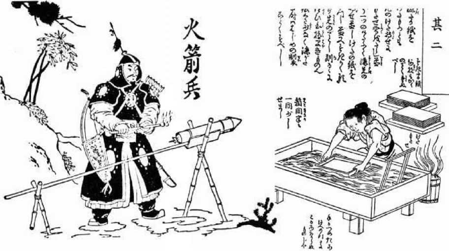 Китайские изобретения: ракеты и книгопечатание. Источник: www. rimv. ruРакеты были впервые применены китайцами во время боевых действий в XI в. и позднее активно использовались армиями Чингисхана и его преемников. В XIII в. в Китае было впервые применено некое подобие ружья, стреляющего металлическими шариками. Книгопечатание появилось в Китае, по-видимому, в районе VIII в., хотя бумага была изобретена еще во II в.н. э. и с тех пор широко использовалась.
