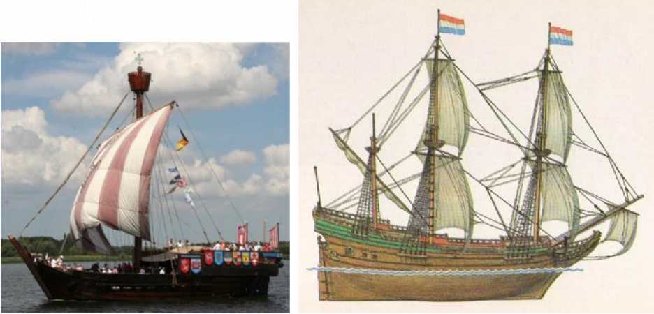 Западноевропейские суда XIII–XVII вв. Источники: www. epochtimes, сот, иа, http://korap.nt Ганзейское военно-торговое судно – когг (слева) – типовое судно, использовавшееся для перевозок торговых грузов в Балтийском море в XIII–XV вв. Длина – порядка 20 м, грузоподъемность измеряется даже не сотнями, а всего лишь десятками тонн. Галеон-пинасс XVII века (справа) – самый распространенный тип крупных военно-торговых судов той эпохи, наряду с галерами, каравеллами и каракками (в то время практически не было различия между военными и торговыми судами – все эти суда являлись и военными, и торговыми одновременно). Длина самых крупных трехмачтовых кораблей составляла порядка 40 м, максимальная грузоподъемность -1000 т, хотя есть мнения, что тоннаж отдельных экземпляров галеонов (пинасе) мог достигать 1500 т. а некоторых каракк – 2000 т.( http://flaco . ucoz. ru/blos/korabli i korahlestroenie 15kh_l 8kh vekov/2009-11-30-51)Вместе с тем, максимальная грузоподъемность судов в античности достигала 4000–5000 т.
