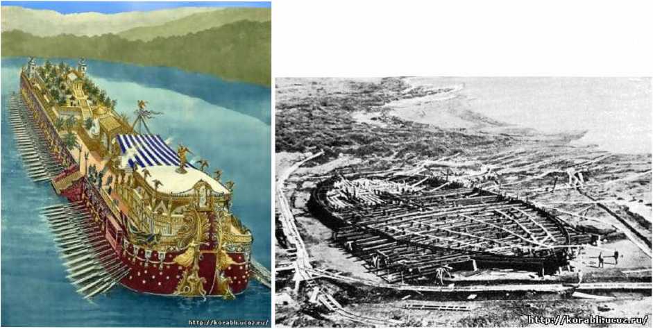 Римские императорские галеры (реконструкция и остов) Источник: http:, korabli.ucoz.ru Остовы двух этих галер эпохи императора Калигулы (37–41 гг. н. э.) были подняты со дна озера Неми в Италии в 1920-е годы. Длина кораблей составляла около 70 м. ширина – 20 м. Галеры имели водопровод с горячей и холодной водой и систему отопления, для чего использовались свинцовые и керамические трубы, были снабжены насосами для откачки воды и имели вращающиеся платформы, для чего применялись шарикоподшипники. http://korabli.ucoz.ru/news/samie_bolshie_korabli_mira/2009-05-01-233 Водоизмещение и грузоподъемность каждой из этих двух античных галер в разы превышали водоизмещение и грузоподъемность самых крупных западноевропейских судов XVII века.