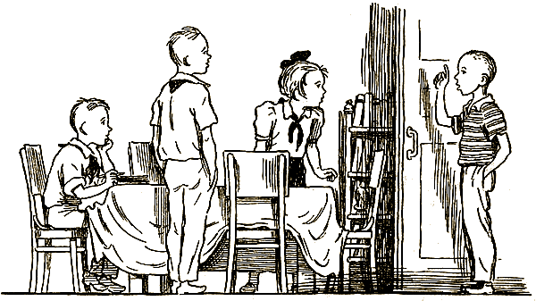 Вдруг раздался звонок. Через несколько секунд с треском распахнулась дверь комнаты. Пошатнулась этажерка, полетел на пол стул. Воробей в испуге слетел с подоконника. Это пришел Вовка Грушин. Он прищурил свои близорукие глаза и громко спросил:
