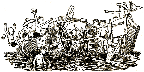 Река возле лагеря была неглубокая, не больше метра глубиной. Суда маневрировали друг возле друга, ребята черпали кружками воду и выплескивали ее в противника. Дым стоял коромыслом! Каждую секунду восемнадцать кружек воды выплескивалось в лодки; на обоих берегах орали ребята, разделившиеся на «красных» и «синих». Кончалось тем, что одна из лодок шла ко дну. Экипаж ее, фыркая, выбирался на берег. Тогда деревянный крейсер всплывал, и его уводили победители.