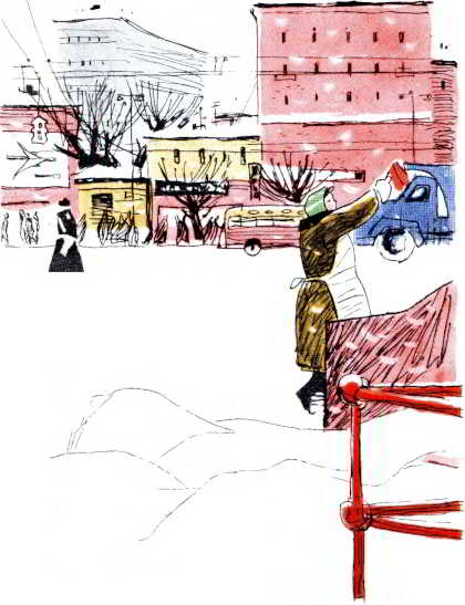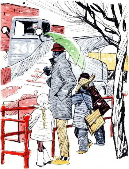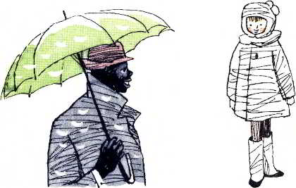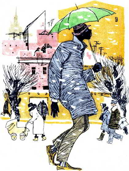 Только высокий, длиннорукий негр испытывал крайнюю неловкость, шагая по заснеженной улице. Он не знал, как уберечься от снега. Он с опаской косится на белые хлопья, летящие откуда-то сверху, и ставит ноги осторожно, как в комнате, в которой недавно выкрасили полы. А в руке он держал зелёный раскрытый зонт.