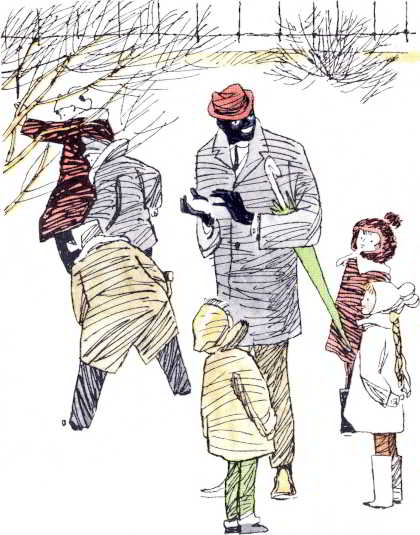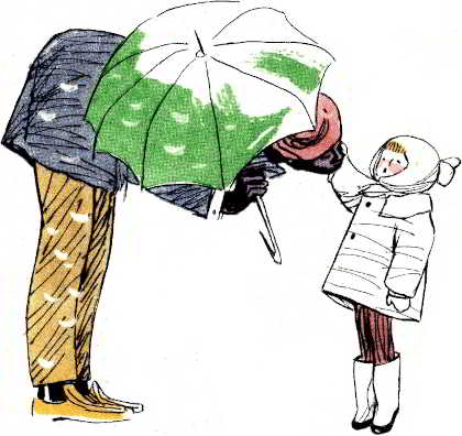 За негром шла девочка. Она беленькая, а чёрные у неё только глаза и галоши на валенках. Девочка шла и прислушивалась, как шуршат снежинки, ударяясь в зелёный купол зонта.